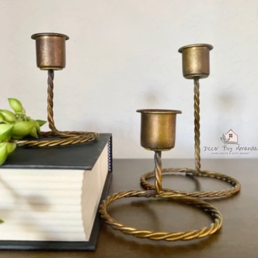 These Twisted Rope Candle Holders will add a unique touch to your home decor. Featuring an antique brass finish and a twisted rope design, they offer a modern, stylish look to any room. Set of 3 includes one of each size. Tapers available here