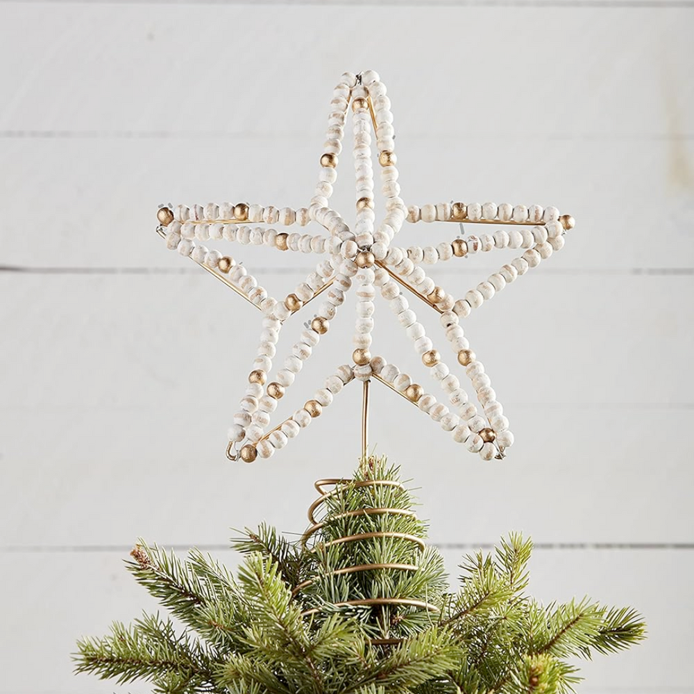 Decorate your tree with our Beaded Star Tree Topper. This beautiful wire star tree topper features white and gold mango wood beaded details with a distressed finish. The gold spring makes it so easy to add to the top of your tree