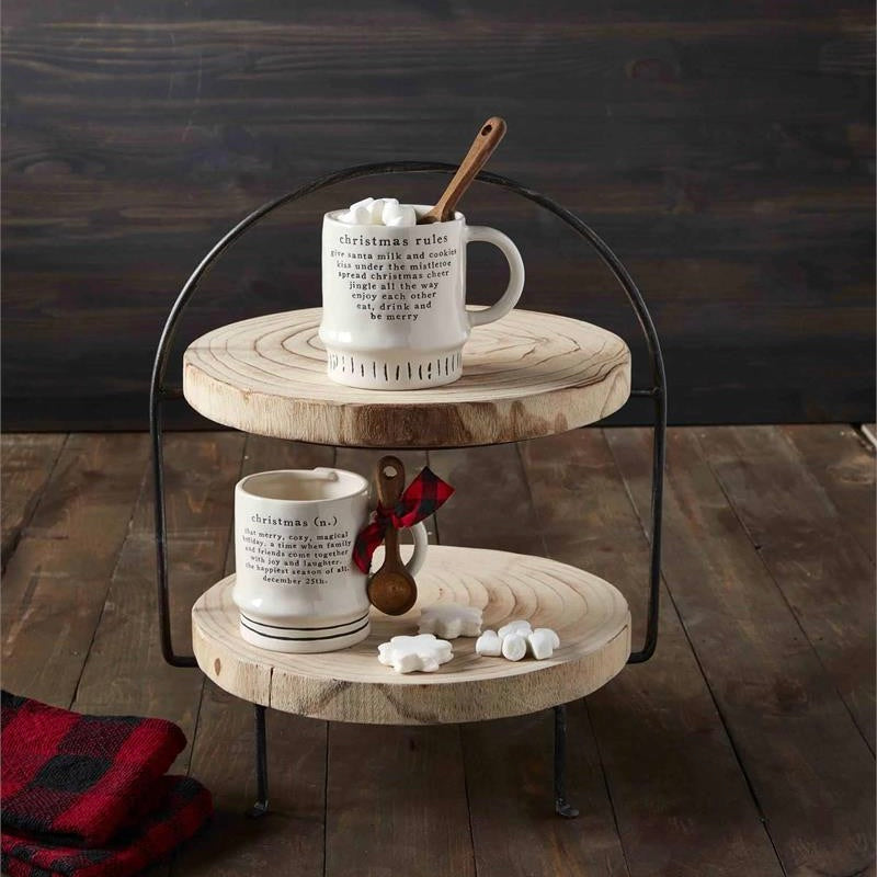 Enjoy your favorite cold weather drink in these Hot Chocolate Christmas Mug Sets. The 2-piece sets include a sentiment ceramic mug and wooden spoon that is tied to the mug with a festive plaid ribbon. Pair with your favorite hot chocolate mix for an easy gift. Available in 2 styles "Christmas Definition" and "Christmas Rules", each sold separately