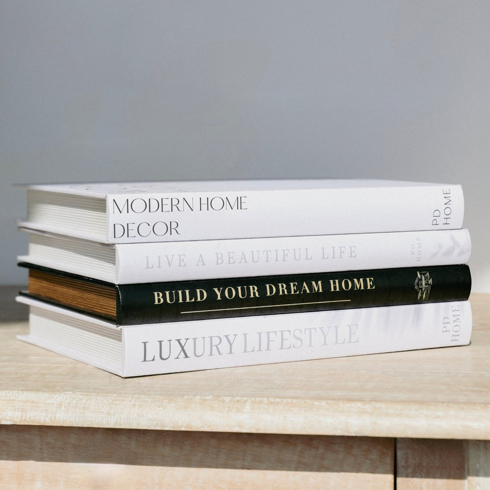 This Set of 3 Decorative Storage Books add height to displays, elevate candles or plants while creating dimension and depth to tabletops and bookshelves. They also double as storage! The top of each storage book opens to store small items such as a TV remote or drink coasters. Set of 3 includes one of each design; "Luxury Lifestyle", "Build Your Dream Home" and "Modern Home Decor"