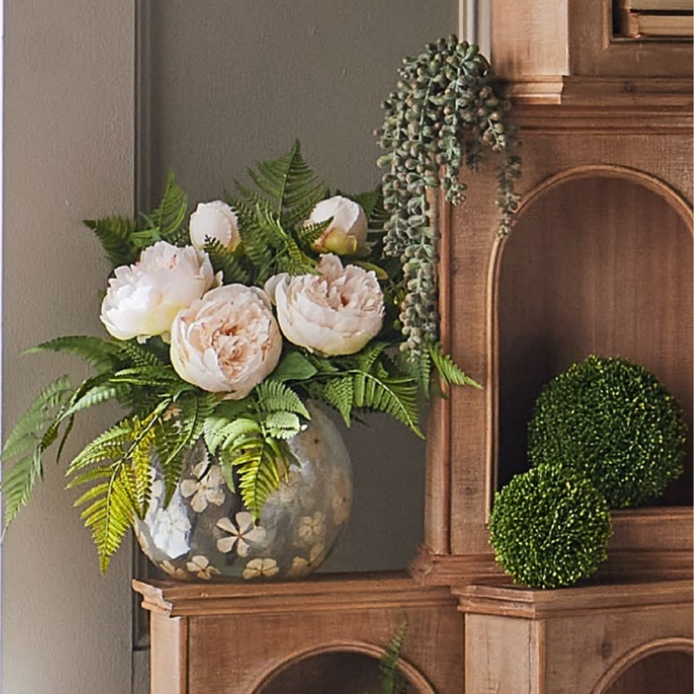 Our graceful white and cream Dried Floral Glass Bowl showcases an organic, round shape, beautifully accented with a delicate dried flower inlay. Ideal for adding a touch of natural beauty to your room, it’s not only perfect for displaying flowers but also holds a 3" pillar candle, creating a warm, inviting ambiance