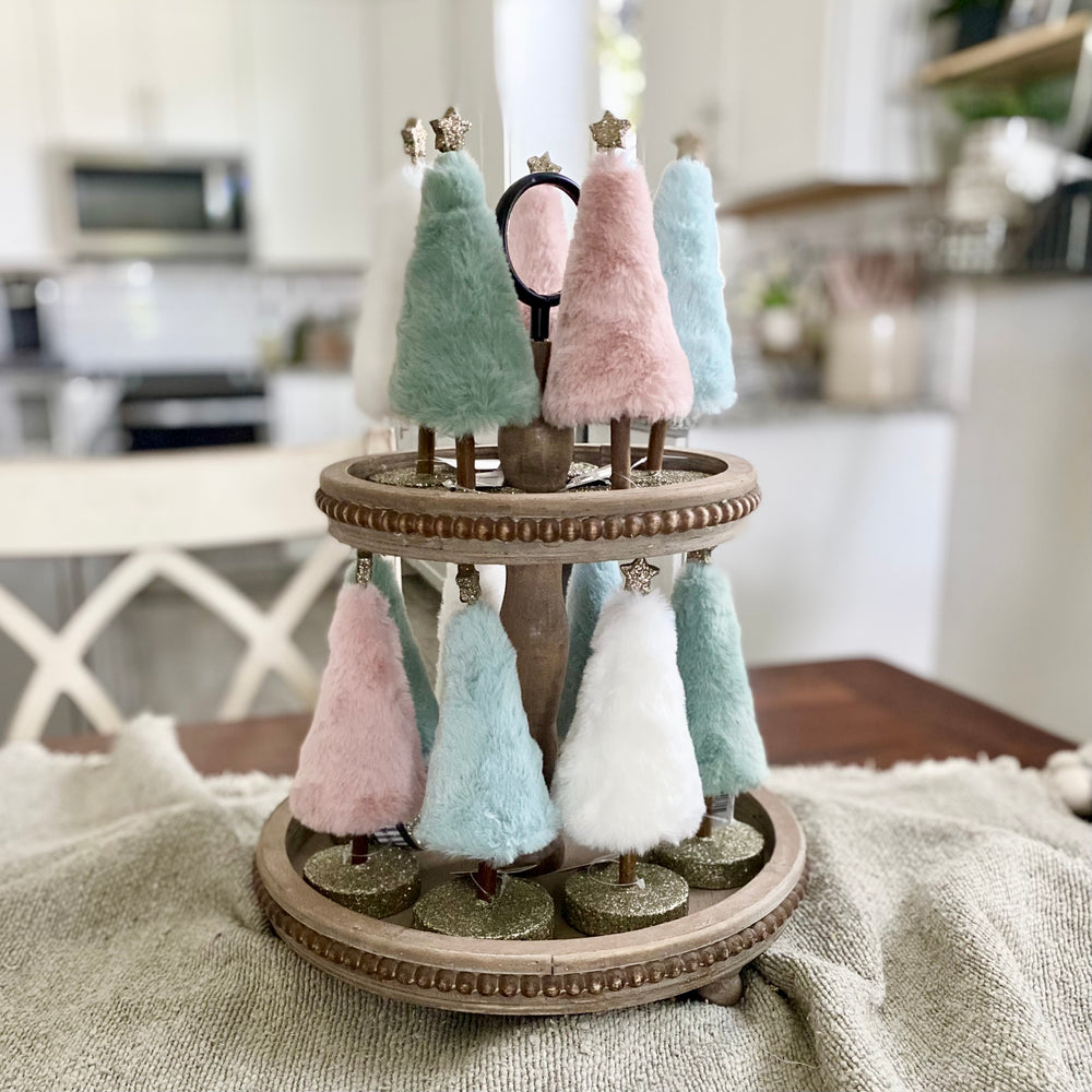 Add a whimsical touch of glam to your holiday decor with this charming Set of 4 Fur Trees. Each tree features a plush, velvety-soft fur finish in a delicate palette of mint, sky blue, baby pink, and snow white. Topped with a sparkling gold glitter star and anchored on a coordinating glittered wood base, these trees bring festive shimmer and playful elegance to mantels, shelves, or table displays.