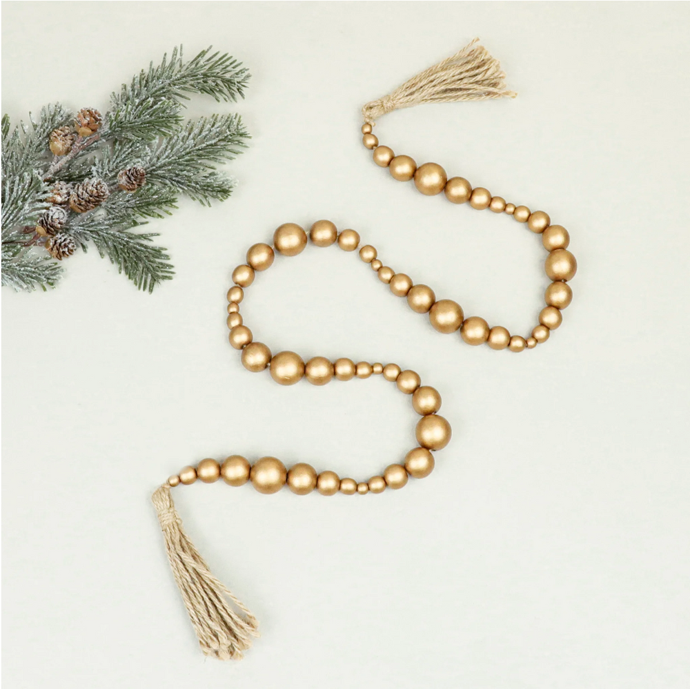 This festive string of Gold Bead Garland is the perfect accessory for a dazzling Christmas scene, featuring gold-painted wooden beads and jute tassels. Trim your tree, drape from your mantel, wrap around the neck of a vase, strewn across a decorative tray or woven through your tablescape, it instantly adds a touch of holiday cheer and a luxe look to your seasonal displays