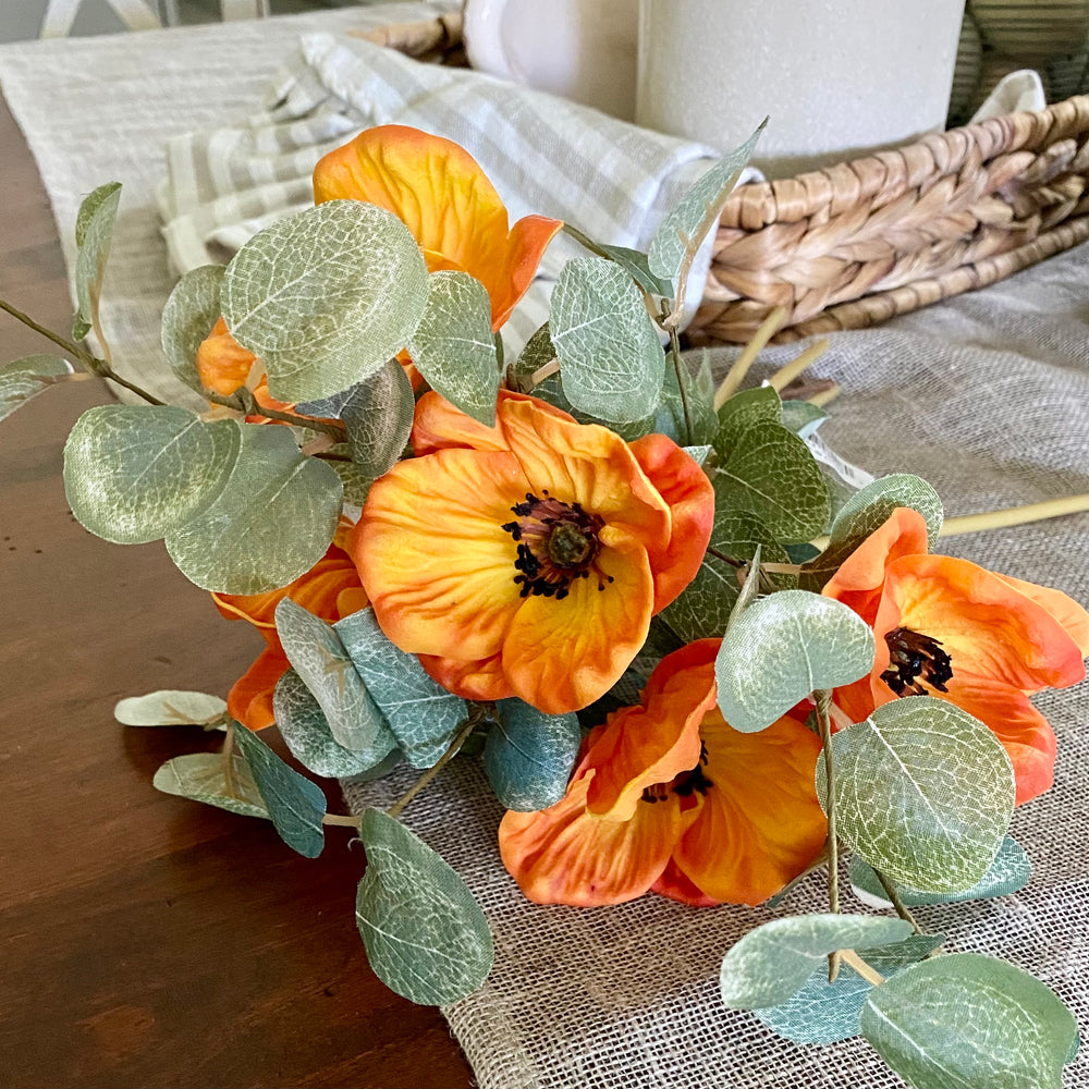 Our Orange Real Touch Poppy Bundle features lifelike poppy petals that deliver a vibrant burst of warm yet energetic color to your space. Poppies, celebrated for their striking blooms and delicate, papery petals, are a timeless symbol of beauty. Each bundle includes six individual poppies, elegantly tied with raffia for a natural touch. (Vase not included)