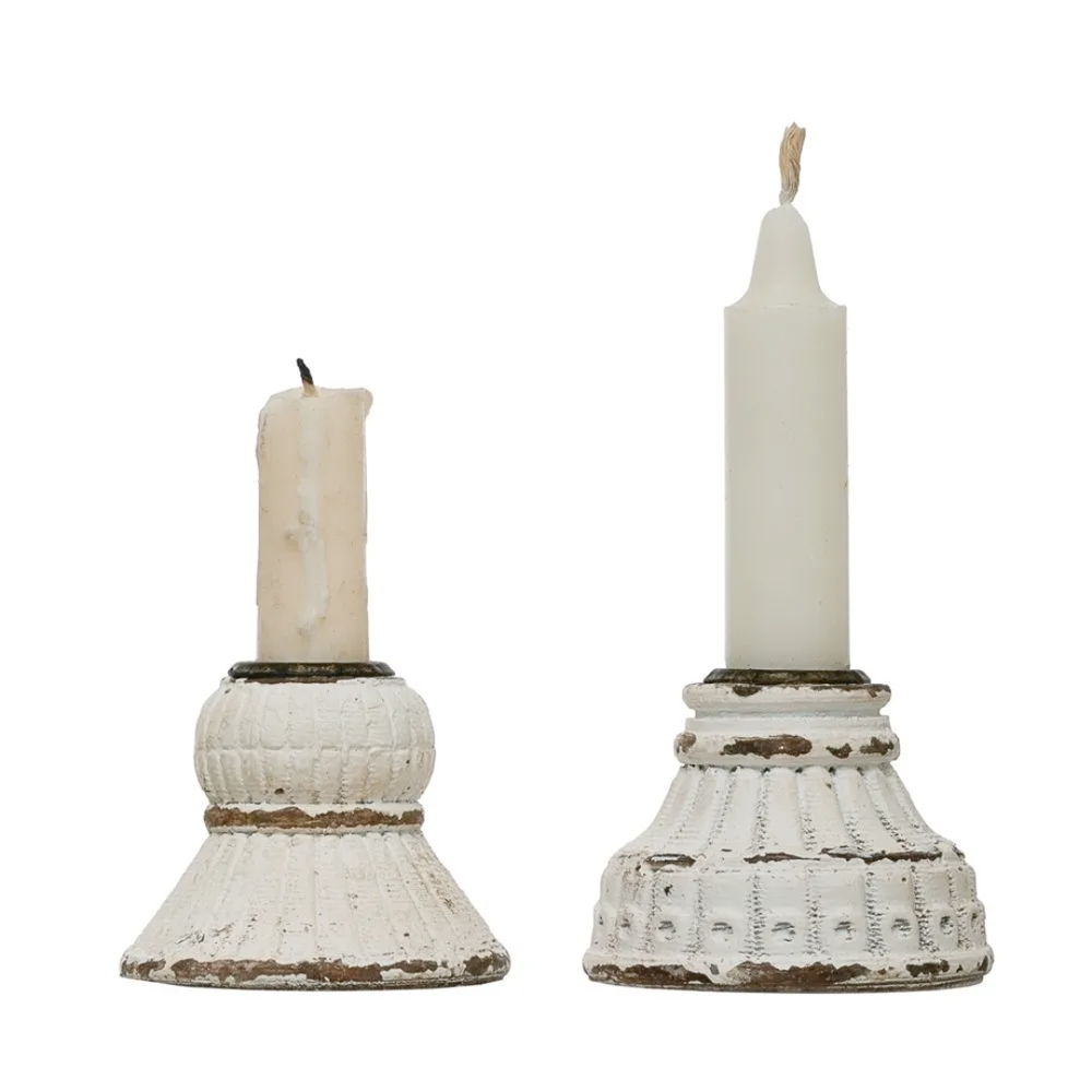 Bring timeless elegance to your table with our Vintage Resin Taper Holder. Crafted in a shabby chic style, it features an embossed design and a distressed white finish with an antiqued patina - perfectly capturing that vintage, romantic charm. Whether you're setting the mood for a candlelit dinner or adding a touch of nostalgia to your decor, this piece is a beautiful accent. Available in two styles, each sold separately. (Candles not included.)