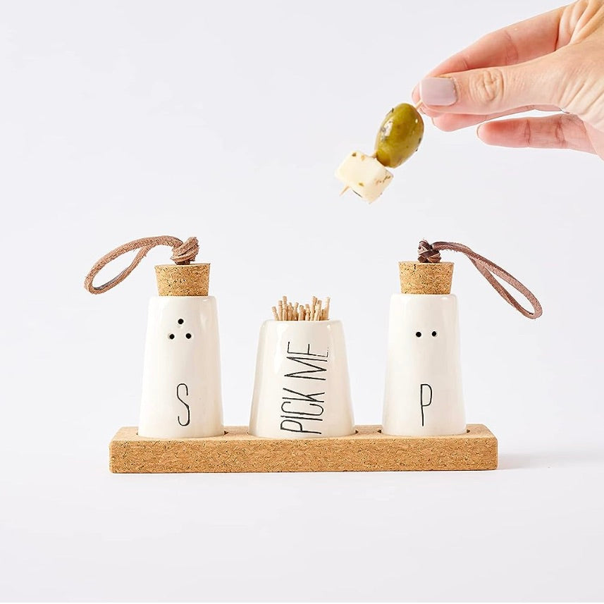 It's so convenient to keep everything in one place with this 7-Piece Salt, Pepper & Toothpick Set. Includes two ceramic salt & pepper shakers featuring debossed letters "S" and "P" and cork stoppers with genuine leather loops. The shakers sit on a cork display tray with coordinating ceramic toothpick holder and one pack of wooden toothpicks