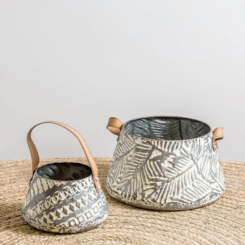 Unique in shape, design, and texture, our Set of 2 Whitewashed Langford Baskets are sure to bring a touch of farmhouse charm to your room. These galvanized metal nesting baskets feature a whitewash textured finish, the larger basket a leaf imprint and the smaller basket a multitude of shapes. Perfect for storing, organizing and decorating these baskets are both functional and stylish. Set of 2 includes one of each size