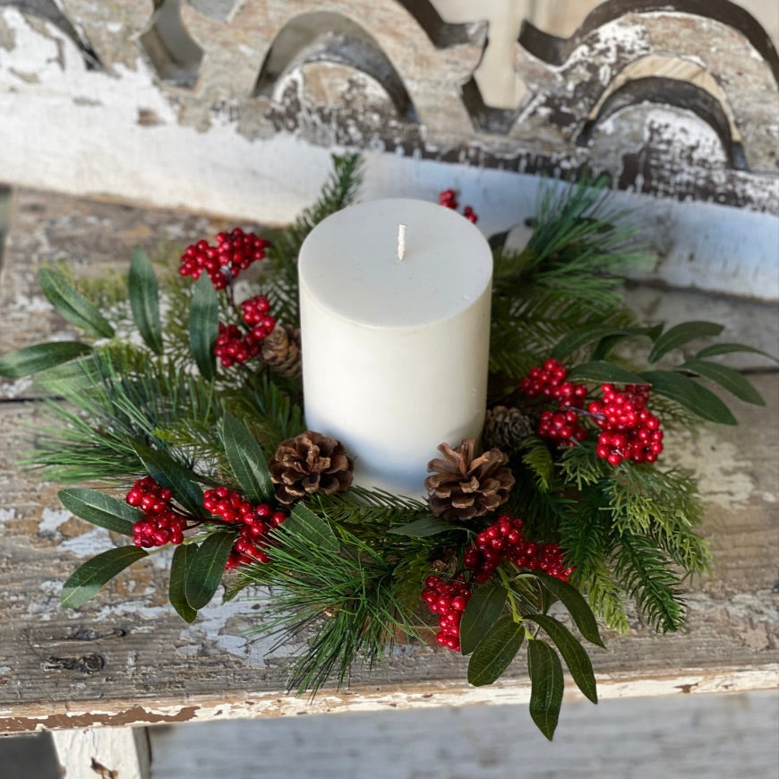 The Pine & Plenty Candle Ring is abundant in texture and brilliant seasonal colors. Features mixed evergreen greenery decorated with sprigs of elongated leaves with variegated veining and topped with bright red berry clusters and natural pine cones. Adorn your candles or use as a wreath to hang from cabinet doors, dining chairs or a hall mirror