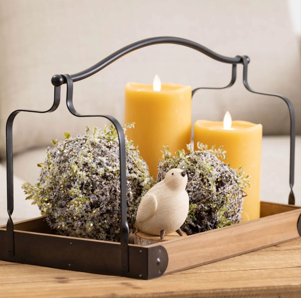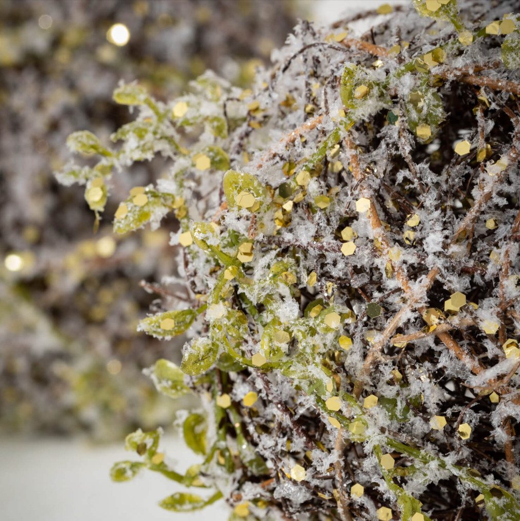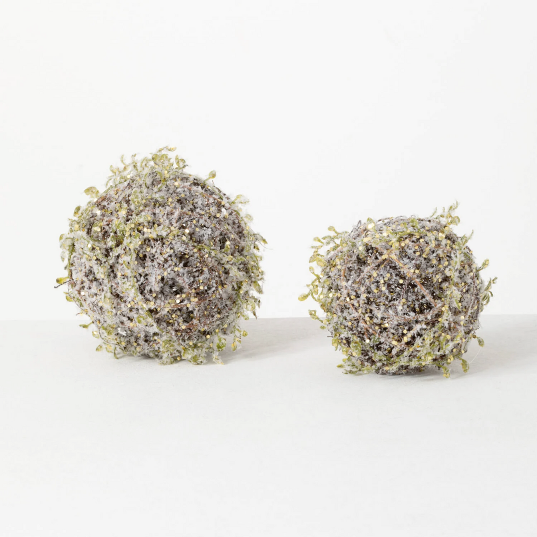 This Set of 2 Frosted Twig Spheres will fit into a rustic holiday theme to a completely contemporary style. Featuring a dusting of golden glitter sparkles and blanketed in a soft white finish to resemble freshly fallen snow. Set includes one of each size. (Props not included)