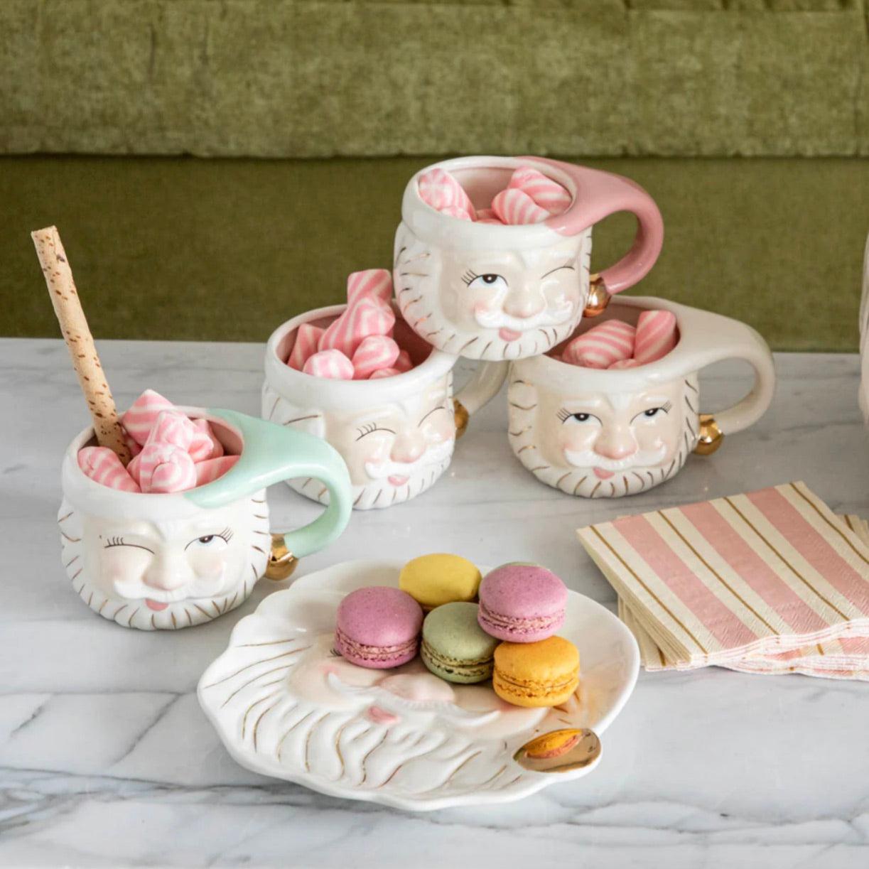 Delight in the magical, nostalgic charm of the Papa Noel Collection! The Papa Noel Mug is a unique, whimsical piece, a must-have for your existing vintage collection or to add to it! Handmade and hand-glazed with gold accents, enjoy your morning cup of coffee or hot chocolate on a snowy winter night with this fun Santa-inspired piece! Choose either vintage mint or pink, each sold separately. Food safe.