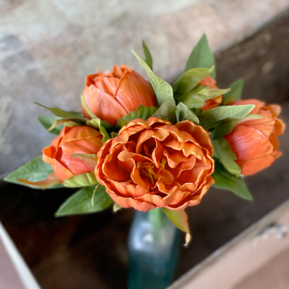 A glorious bundle of Real Touch Persimmon Peony Blooms brings a bold burst of bright orange tones, capturing the look of petals just about to unfurl. Their rich, lifelike texture adds instant warmth and elegance to your fall and winter decor. Bundle includes five stems, tied with raffia for a charming, natural touch. (Props not included)
