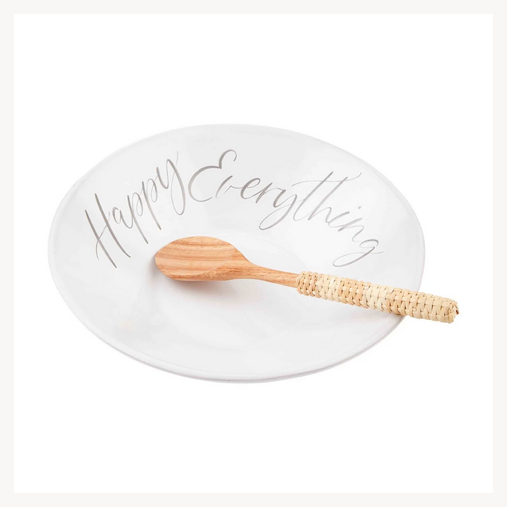 Celebrate in style with the Happy Everything Serving Bowl Set. This cheerful 2-piece set features a beautifully glazed terracotta bowl paired with a coordinating wooden spoon, complete with a charming rattan-wrapped handle. The interior of the bowl is adorned with the uplifting sentiment, "Happy Everything," making it the perfect addition to any gathering. Whether serving up your favorite dish or using it as a decorative piece, this set brings a touch of happiness to every celebration!