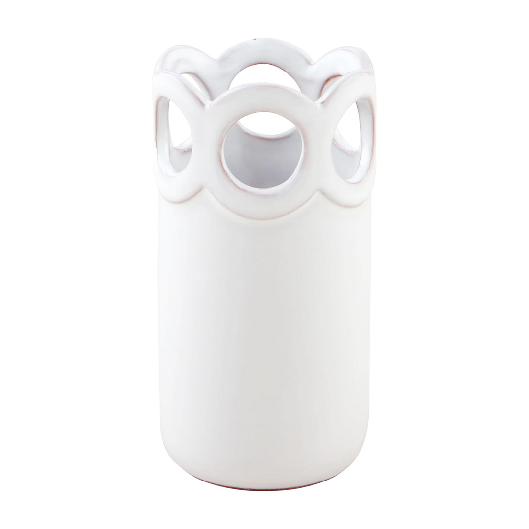 Bring a touch of romance and charm to your home with our Scalloped Edge Bud Vases. Crafted from terracotta and finished in a soft white glaze, each vase features delicate scalloped cut-outs that create a light, graceful feel. Perfect for bedside blooms, a sunny windowsill, or a styled shelf, these petite pieces add effortless elegance to any nook. Available in two sizes to mix and match - each sold separately and fully watertight. Pair with our matching Scalloped Utensil Holder for a beautifully coordinated, timeless display.