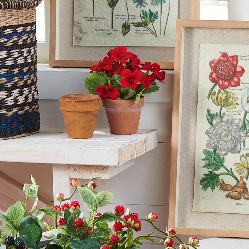 This Potted Red Geranium adds a vibrant splash of color to any space. With its bright cheery blooms and large green foliage it will be the perfect addition to your tiered trays, countertops, shelves or window sills. (Props not included.)