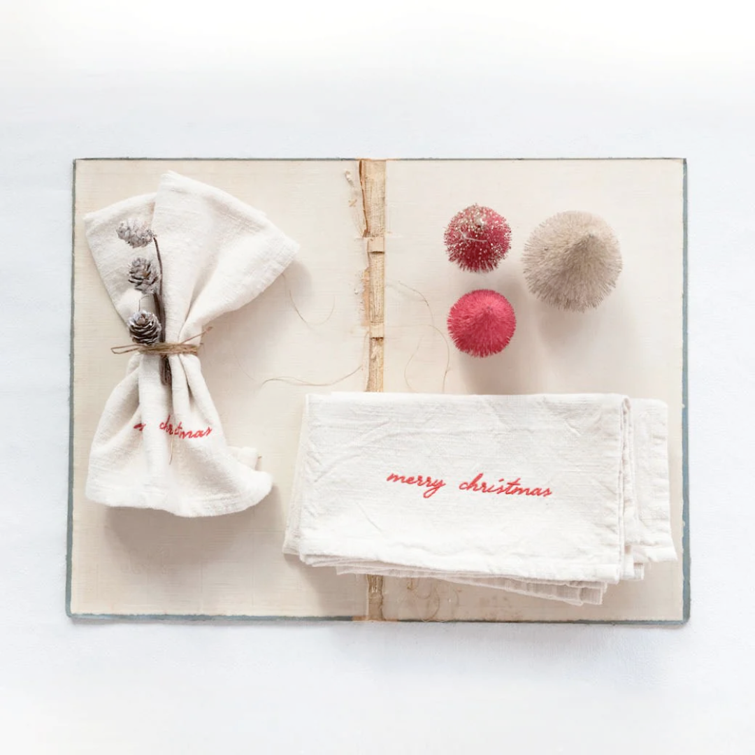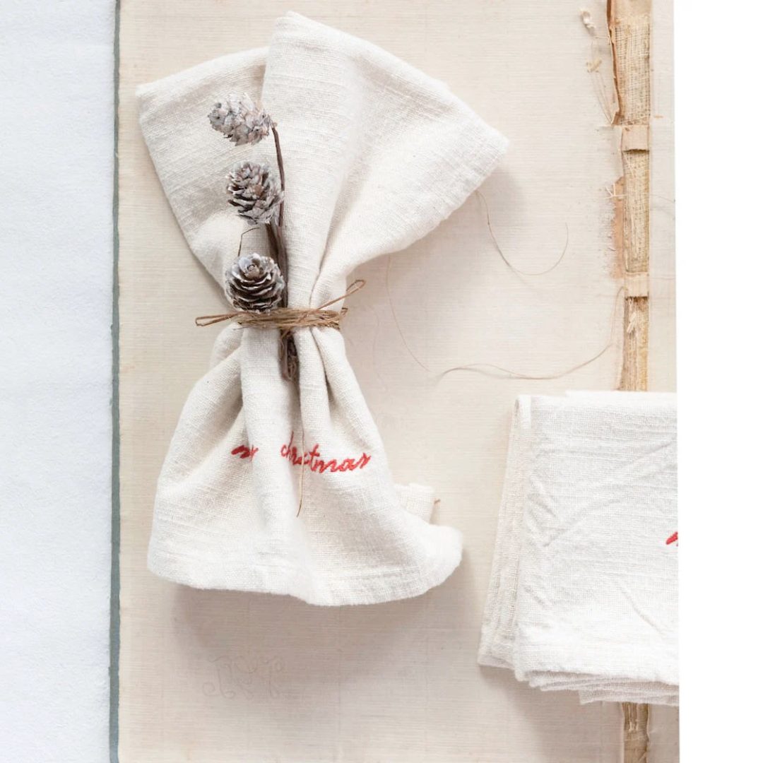 This Set of 4 "Merry Christmas" Napkins are an easy way to add a touch of festive flair to your tablescape while being perfect for entertaining guests. Featuring soft cotton fabric and "Merry Christmas" embroidered in red. The neutral cream palette will complement both patterned and solid dinnerware. Pair them with the matching table runner