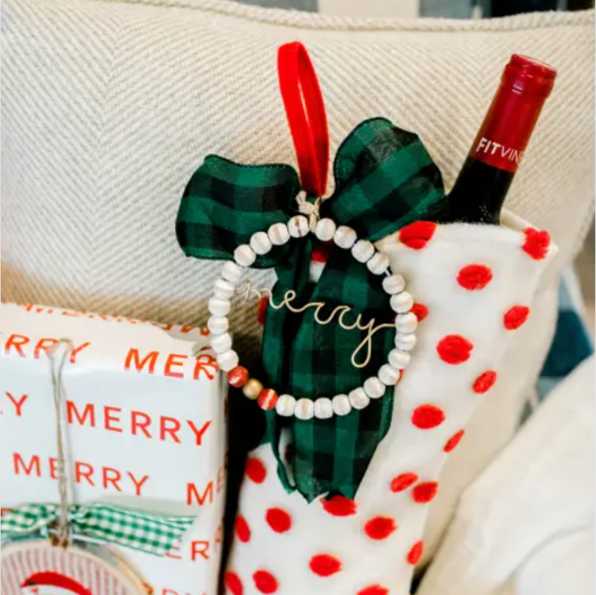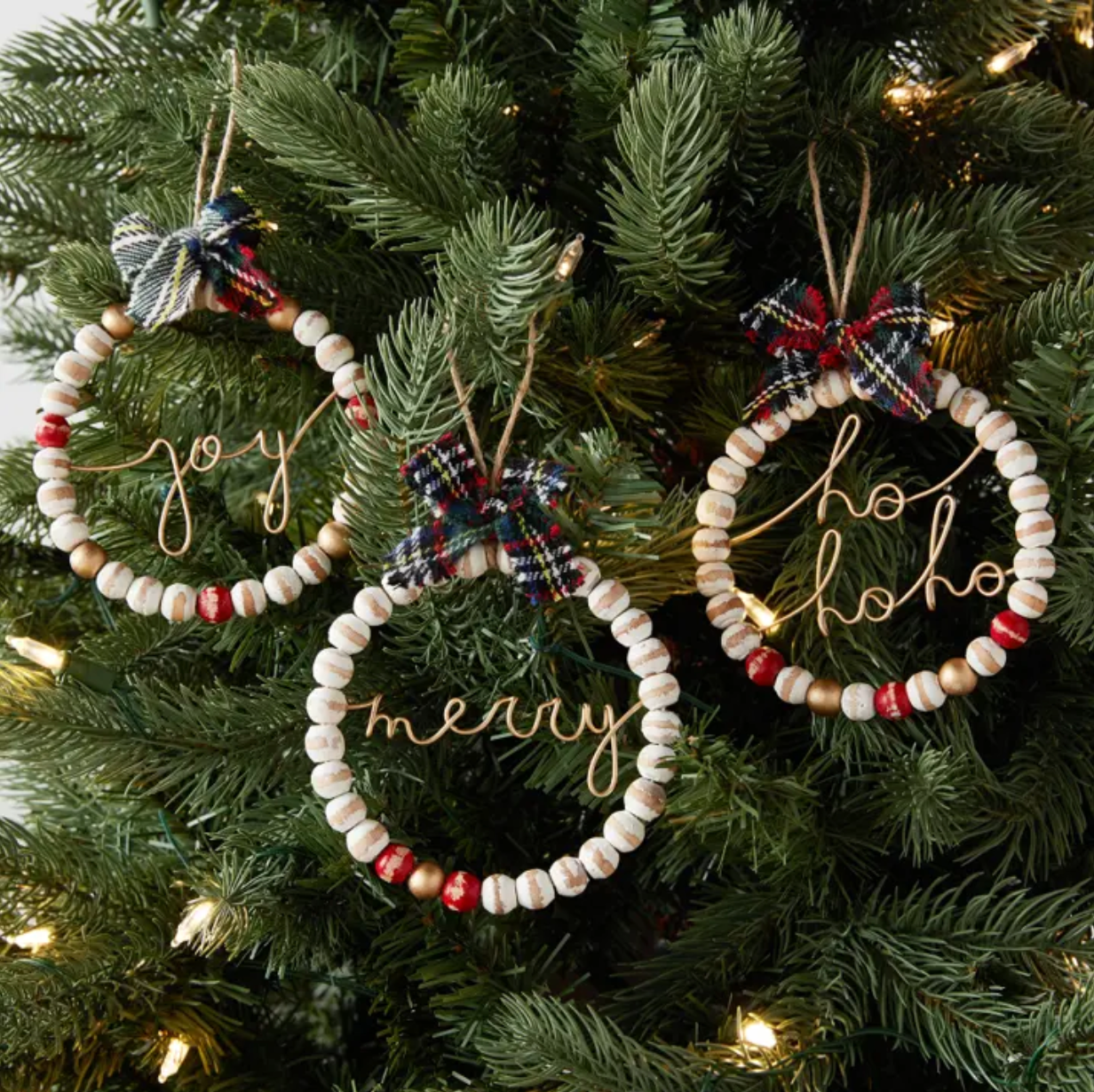 Bring a vintage flair to your holiday decor with this beautiful Wood Beaded Ornament Set of 3. Handcrafted of mango wood featuring a classic farmhouse design with tartan bows and center wire sentiments that read "joy", "merry", and "ho ho ho". Not just for the tree, hang them from wreaths, stockings even wrapped gift boxes! Set includes one of each style.