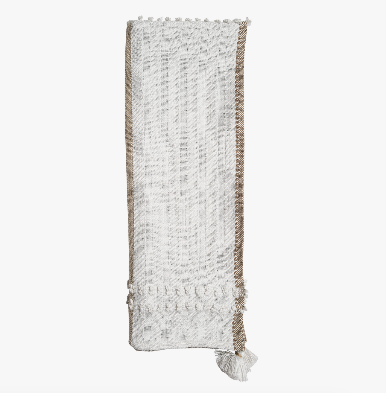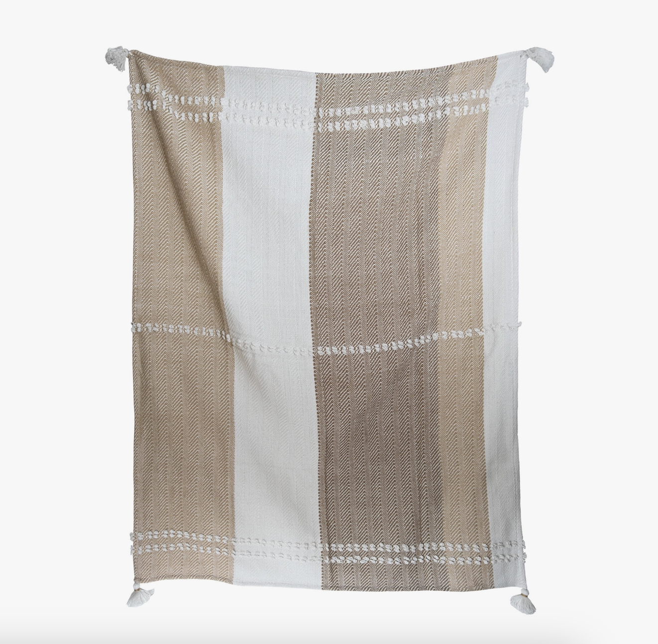 This Hand Woven Cotton Throw Blanket features neutral brown & cream hues in a charming modern farmhouse patchwork plaid design with corner tassels