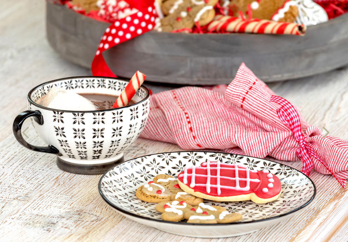 Teacup with cookies on a decorative plate on a wooden surface