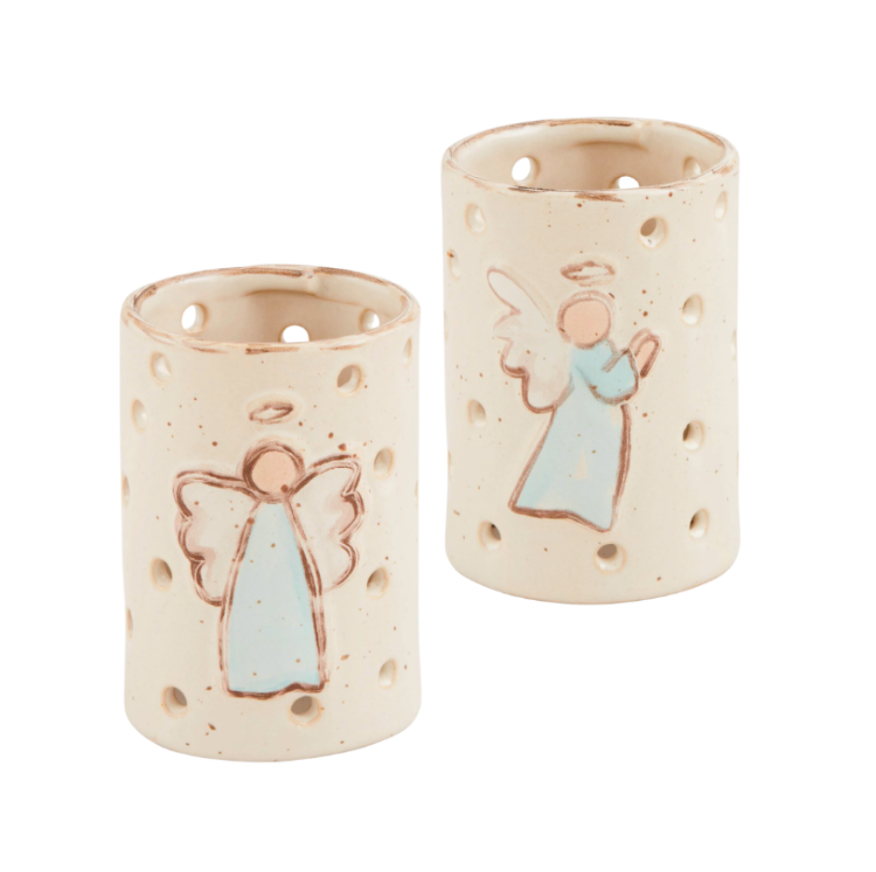 Add a touch of rustic charm to your holiday decor with our Set of 2 Farmhouse Angel Votives. Their intricate cut-out details create a cozy ambiance, perfect for adding a warm glow to a Christmas gathering. Expertly crafted for a sweet and charming addition to your home. Set includes one of each style