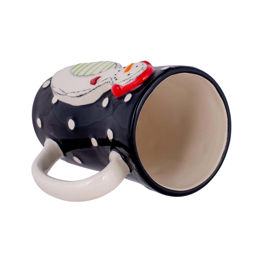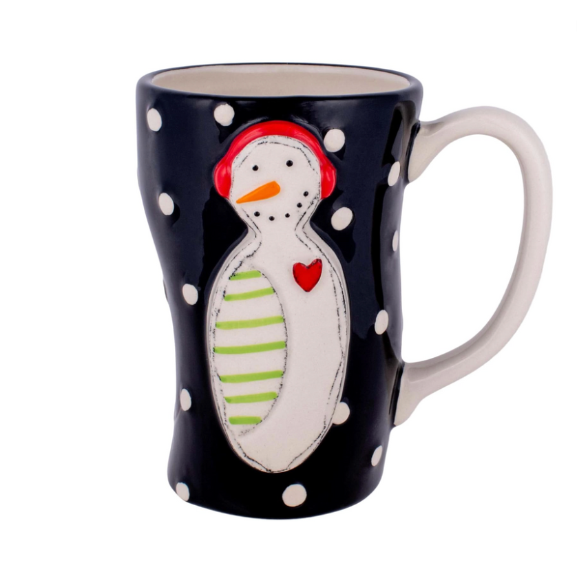 This cute Set of 2 Snowman Polka Dot Mugs are the perfect playful pieces to gift any coffee, tea or cocoa lover this season. Designed with a whimsical appearance that looks like they're leaning slightly to their side. A playful black and white polka dot pattern pairs perfectly with a friendly snowman character wearing a cozy scarf and earmuffs for a wintry feel. This artisan hand-sculpted and painted ceramic mug set features unique textures and dimensional details that adds spirit to everyday coffee or tea time.