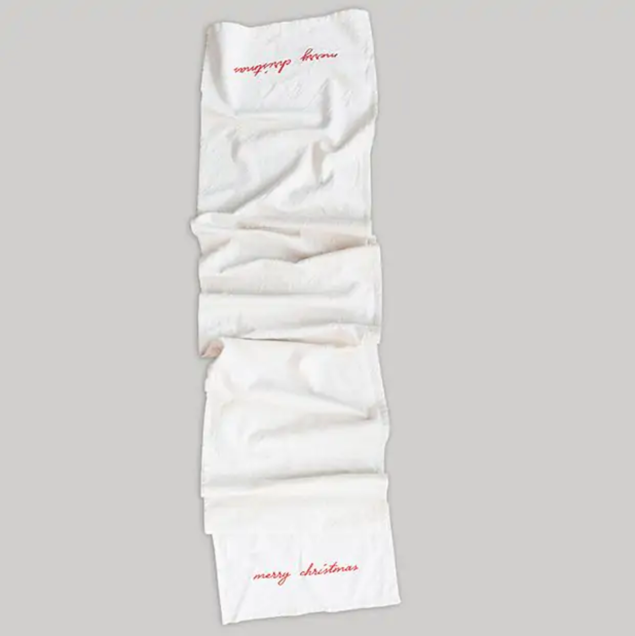 This simple yet sophisticated rustic farmhouse style "Merry Christmas" Table Runner features "Merry Christmas" embroidered in cursive in red. The soft neutral cream palette will complement both patterned and solid dinnerware. Matching napkins available here
