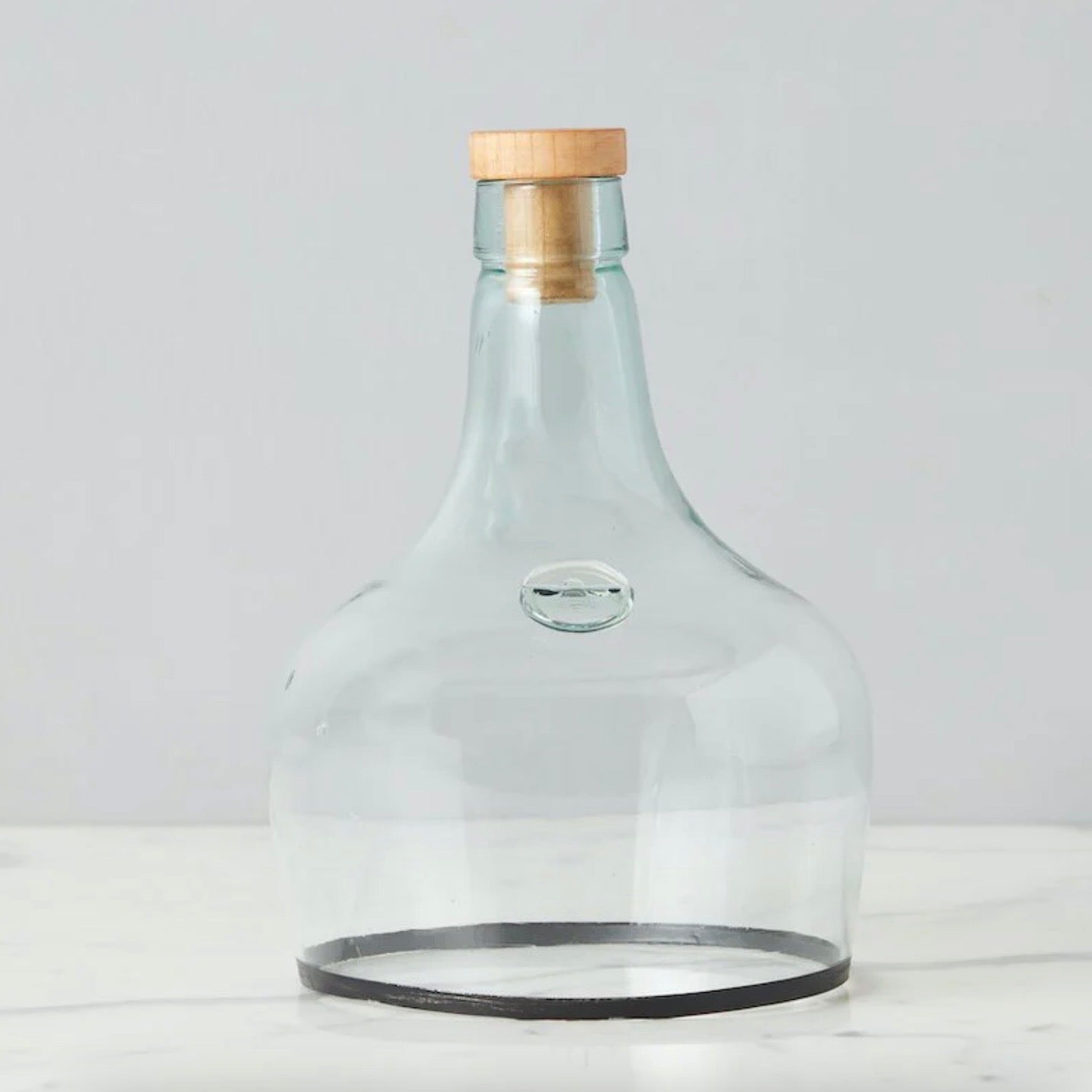 The dramatic silhouette of a vintage wine bottle demijohn created the perfect shape for our Demijohn Cloche. Made of recycled glass mouth-blown into authentic inspired molds, the cloche is the upper half of the bottle after being cut in two. Featuring a distressed black rim and topped with a sustainably-sourced wood cork, this decorative accent is perfect in its practical use as a fruit, cheese or bread cover, or simply as a terrarium. Pair this glass cloche with serveware pieces like cake stands, serving trays, trivets and cutting boards (not included.)